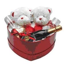 Caixa em formato de coração tamanho M contendo: 02 mini ursinhos ou 02 mini corações de pelúcia, 02 taças de vidro para espumante, 01 espumante, 01 caixa de brigadeiros gourmet com 8 unidades e 01 cartão personalizado.
